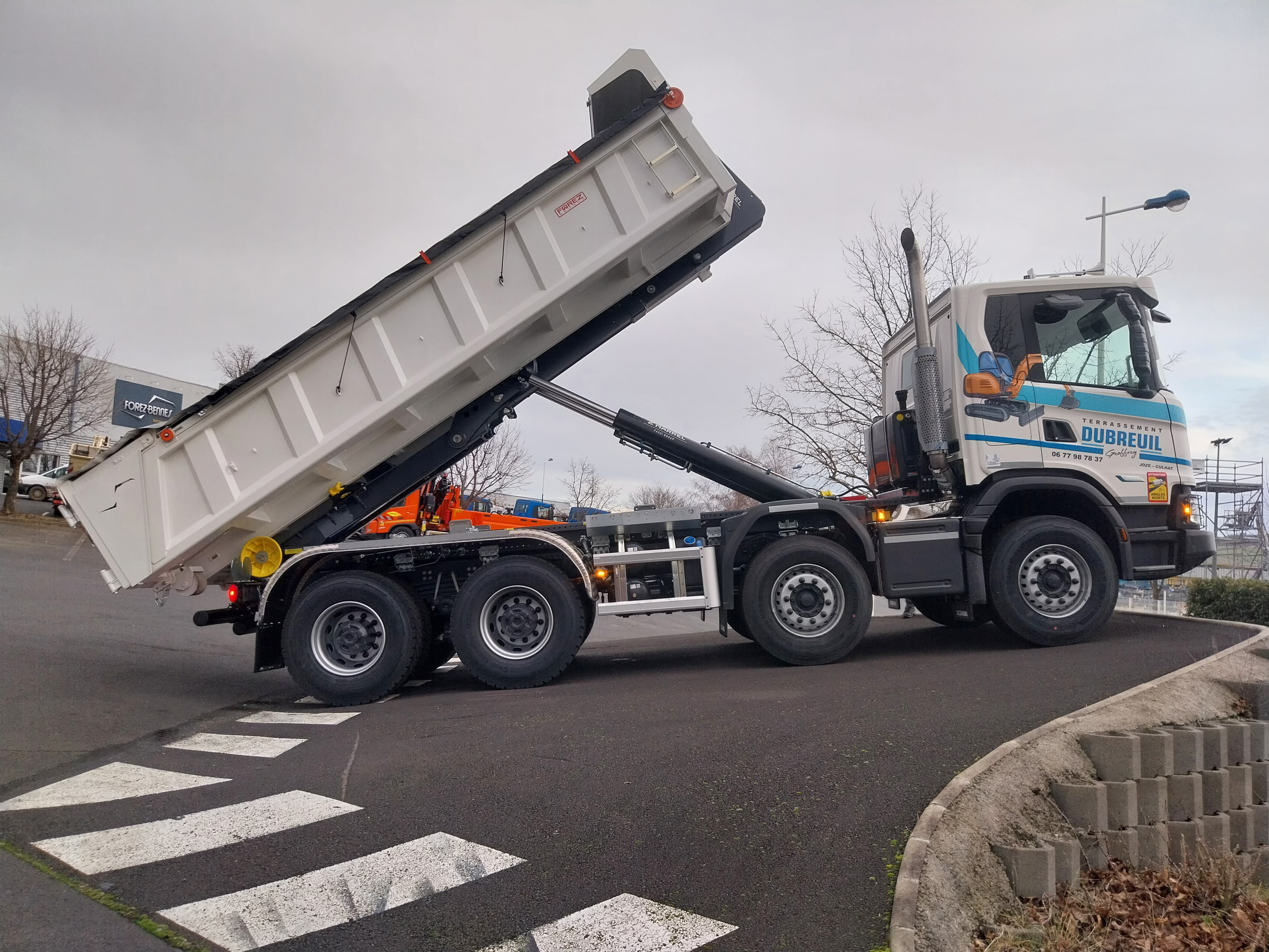 Avec un PTAC de 32T et une charge utile de 16T, il est équipé d’une benne avec bâchage, porte arrière hydraulique et trappes, idéal pour le transport de matériaux ou l’évacuation de déblais.